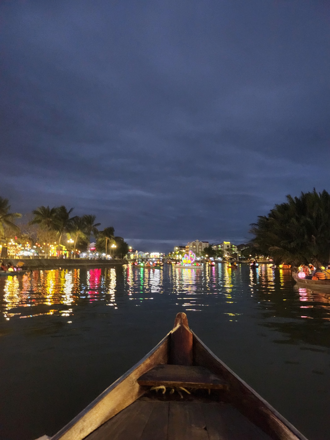강 양쪽에 늘어선 등불과 반짝이는 물빛, 나무배들이 한 폭의 그림 같아요.
